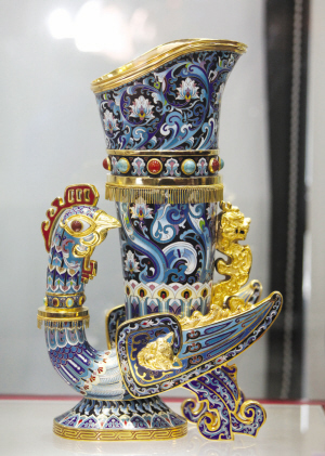 而“鳥杯”是將朱雀鳥的造型做了變形,頭戴金冠的朱雀鳥回首翹尾,杯體是鳥身,尾部上翹呈馬蹄形,又像一個號角。鳥的雙爪被演化成為杯體兩個支點,該作品是景泰藍(lán)與花絲、玉石相結(jié)合的精品佳作。