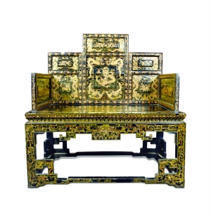 寶座是皇帝的專座,是皇帝權(quán)力和威望的象征。據(jù)悉,此次拍賣的五屏式填彩漆龍紋寶座規(guī)制嚴(yán)格,通體黑色漆地,以雕填手法裝飾各式花紋。高110厘米,寬104厘米,進(jìn)深73厘米,四角抹圓呈弧形,方中帶圓。面上五屏式座圍,正中稍高,兩側(cè)遞減,在座面轉(zhuǎn)角處,隨座面弧圓作出軟彎。座圍五塊,與座面活榫接合。