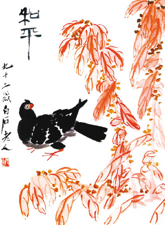 齊白石以花鳥畫見長,他善于將民間藝術的審美情趣融進傳統(tǒng)文人畫,以質(zhì)樸率真之氣開創(chuàng)了文人畫的新境界,畫面洋溢著活潑的生命力,極具明朗、清新之美,充滿了泥土的芳香。技法上,他注重用筆的蒼勁老辣與方折勁挺,筆力雄健,揮寫自如;墨法則講究單純準確,對干濕濃淡的搭配關系極力經(jīng)營;用色則大膽而濃艷,吸收民間美術的敷色特點,卻艷而不俗;構圖上,他多以簡潔之圖,塑花、鳥稚拙之美,但一些作品則極力刻畫蟬、蝶、蟋蟀等小昆蟲,寫實程度足可亂真,與大寫意花卉相配,別具情趣。