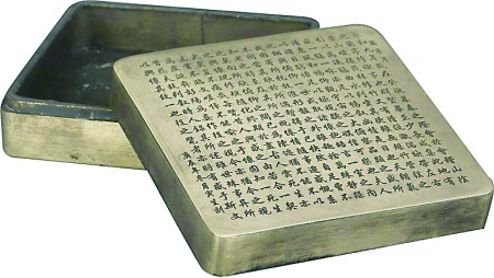 銅墨盒的雕刻多以陰文、陽文、雙鉤線刻為主,銘刻題材多為書法、繪畫、篆刻等,舊時(shí)銅墨盒上的文字、圖案集裝飾性、藝術(shù)性為一體,有淺刻、線刻、陰雕陽刻結(jié)合,書法詩文吉祥佳句、名家繪畫等都可融于銅墨盒的雕刻藝術(shù)之上。銅墨盒大多有作坊標(biāo)記,如同古堂、淳菁閣、榮寶齋、兩明齋、萬豐齋、愚得閣等。銅墨盒雖是小小的文房器物,當(dāng)你靜靜地欣賞把玩各式舊銅墨盒時(shí),你會(huì)感覺到像是在與舊時(shí)文人面對(duì)面地對(duì)話,感受到一種無上妙趣,是舒心悅目的視覺享受!