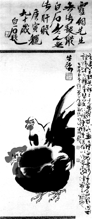 據(jù)李燕說,“文革”中,苦禪先生屢遭批斗、抄家、辱罵、誣陷與毒打。慘痛已極而呼天,人之常情。讀他《梅神萬歲圖》上的題跋:“梅花神萬歲,保佑保佑,南無阿彌陀佛。全家供養(yǎng)敬禱”,當(dāng)時(shí)絕望的心境可知。但苦禪先生有幸,不但有一個(gè)理解并始終信任他的家,而且有許多理解并同情他的普通百姓和民警。在他們的掩護(hù)下,得以暫時(shí)避居于李燕家中。他的多幅小雀棲于蕉葉上下的小品,恐怕也有蕉葉一片,聊避風(fēng)雨的意思,而他那些母子雞圖則是無情世界的有情。冷漠世界中僅余的一絲溫情,往往是使人堅(jiān)持下去的力量。這兩種情感在《蕉葉竹雞圖》的跋語中完整地表達(dá)了出來———“一葉華蓋,聞香不翔”。雖只一片蕉葉,不是什么銅墻鐵壁,但其下有蘭,香韻足可流連。