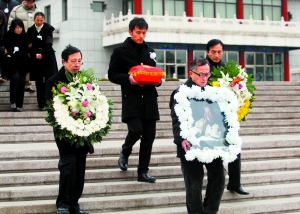 昨天是正月十五,氣溫下降,來自山東、深圳、河北等地的送別人群頂著寒風(fēng)等候在八寶山公墓停車場(chǎng),為張仃先生送行。下午2時(shí)15分左右,張仃先生的靈車到達(dá)八寶山,按照張老生前遺囑,張仃先生的親屬只在停車場(chǎng)舉行了極其簡單的告別儀式。