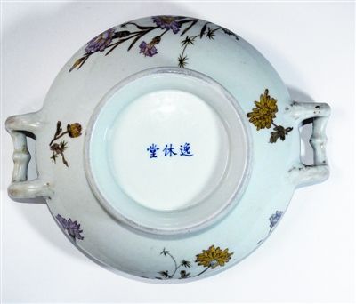 據(jù)他介紹,5年前,他和朋友去湖北農村。在一農戶家,他看到了一個民國粉彩品鍋,造型優(yōu)美,線條流利,其圖案為粉彩折枝花卉,包括石竹、虞美人和菊花,畫藝精湛、清新,呈色淡雅,外底書有“逸休堂”三字款。