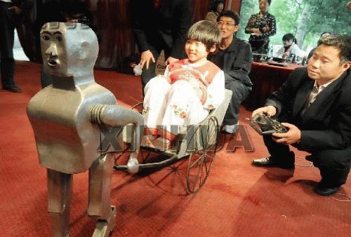 “我叫大洋車,吳玉祿是我爹,我拉我爹去上街,謝謝?!北本W運(yùn)會(huì)開幕式視覺特效總設(shè)計(jì)師蔡國強(qiáng)一坐上農(nóng)民吳玉祿制造的機(jī)器人拉車,機(jī)器人就一邊拉車前進(jìn),一邊搖頭晃腦地滿嘴吆喝,吳玉祿親口錄制的這兩句話通過擴(kuò)音器反復(fù)播放,把蔡國強(qiáng)逗得前仰后合。