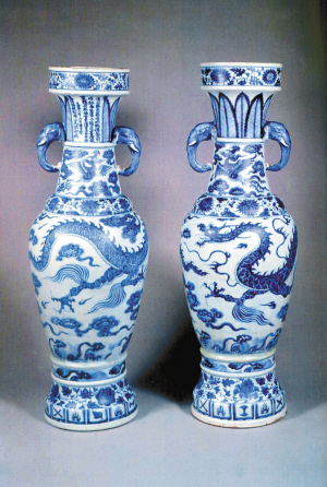 一個(gè)老者拿出一對(duì)元青花象耳瓶給我看,說(shuō)是出土于江西景德鎮(zhèn),自報(bào)價(jià)值5000萬(wàn)元。如果是真品,我認(rèn)為這個(gè)價(jià)格不止,可遺憾的是假的,“出土于景德鎮(zhèn)”那也是編出來(lái)的故事。因?yàn)檫@兩件東西和現(xiàn)藏于英國(guó)某大博物館的“至正十一年”款的青花象耳瓶是一模一樣,是照著人家仿制的。仿制者不知道這對(duì)在英國(guó)的瓶子的耳朵各有圓環(huán),圓環(huán)太脆,都掉了,至今在原來(lái)套環(huán)的部分還有缺釉的痕跡。你拿給我看的東西既無(wú)環(huán),又不缺釉,其他地方完全一樣,不是仿制又能是什么呢?所以我認(rèn)為,辨假識(shí)假,除了學(xué)問(wèn)根底而外,就是要有豐富的閱歷,看的要多。