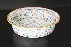 古董文玩專場在2009秋拍“康熙朝”取得好成績的前鑒下,本次春拍推出“乾隆朝”為主題的專場拍賣,以少而精的拍品來迎合藏家們的口味。頗為亮眼的是一件乾隆粉青釉粉彩描金勾蓮紋折沿洗,這件拍品為海外私人收藏,法國巴黎第四大學(xué)藝術(shù)史與考古學(xué)博士、法國東方藝術(shù)研究專家梁璉特為此撰寫文章。該器色彩豐富,紅粉黃綠青藍(lán)紫交相輝映,盡顯盛世萬千氣象;同時因粉青釉襯底,釉色柔和,平添素雅祥和之氣。