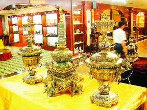 太平友象、宮廷佛塔、龍鳳熏爐、鳳耳熏爐、六角廳鳳首熏爐等七件乾隆年間的重量級掐絲琺瑯宮廷文物,將亮相本屆文博會世紀(jì)工藝分會場。昨天,記者特意來到世紀(jì)工藝珍寶館四樓展廳先睹為快。該文物收藏人王寶山先生表示,將在這次文博會上拍賣太平友象這對宮廷銅象,所得款項(xiàng)將通過文博會組委會全部捐贈給青海玉樹災(zāi)區(qū)。