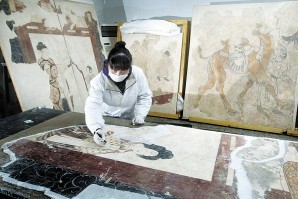 昨日下午,記者在市古代藝術博物館修復室內(nèi)看到,十余名工作人員正對一組墓葬壁畫進行修復。博物館館長王愛文告訴記者,工作人員正加班加點對已經(jīng)發(fā)掘出的壁畫進行修復(如圖),為開館做準備。據(jù)介紹,修復墓葬壁畫是一項極為復雜的工作:工作人員既要耐心、細心,又需一定的繪畫功底和藝術素養(yǎng)。通常情況下,壁畫被揭取后,需要由4個人同時進行修復。對一些破損嚴重的壁畫,工作人員除對其進行正常的修復保護外,還要結合壁畫原有狀態(tài)和自己對壁畫線條、紋路的分析,在電腦上繪制復原圖,再以原始壁畫比對復原圖進行修復。通常來說,修復一組壁畫最長需1年多,最短也需三四個月。