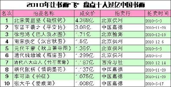 當然,天價還是最被人津津樂道的。2010年全年,共有20件中國藝術(shù)品拍賣價格超過1億元人民幣,幾乎全部刷新了中國藝術(shù)品前十名的價格紀錄,其中的最高紀錄邁進了5億元的新門檻。