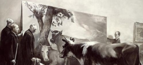 《天真之眼的測試》是藝術(shù)家Mark Tansey在1981年的作品。這幅畫描繪的是一只奶??粗嬂锪硗獾哪膛?,而觀看的奶牛周圍有觀察員看著這個(gè)場景在做筆記。長期以來,這件作品一直被解釋為一種對藝術(shù)評論和偽科學(xué)的藝術(shù)現(xiàn)實(shí)主義的諷刺。(懷心)