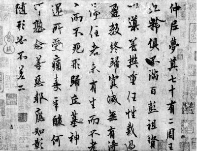 《仲尼夢奠帖》可謂歐體楷書的登峰造極之作。帖云:“仲尼夢奠,七十有二。周王九齡,俱不滿百。彭祖資以導(dǎo)養(yǎng)。樊重任性,裁過盈數(shù),終歸寂滅。無有得停住者。未有生而不老,老而不死。形歸丘墓,神還所受,痛毒辛酸,何可熟念。善惡報應(yīng),如影隨形,必不差二?!睍üP力蒼勁古茂。元人郭天錫在跋中曰:“此本勁險刻歷,森森然如武庫之戈戟,向背轉(zhuǎn)折深得二王風(fēng)氣,世之歐行第一書也?!贝颂肽纤蝺?nèi)府收藏,后經(jīng)南宋賈似道、元郭天錫、明項元汴、清高士奇、清內(nèi)府等遞藏。
