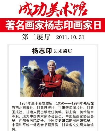 中國(guó)美術(shù)家協(xié)會(huì)會(huì)員、中國(guó)版畫畫家協(xié)會(huì)會(huì)員,西部著名畫家楊志印先生以擅畫駱駝著稱,他以獨(dú)創(chuàng)的“沖墨法”所畫的駱駝形神兼?zhèn)?、栩栩如生,被譽(yù)為“神州畫駝第一人”和“駱駝王”。近些年,其作品頗受市場(chǎng)追捧,曾被國(guó)內(nèi)外美術(shù)場(chǎng)館及收藏界人士競(jìng)相收藏。在10月10日成功美術(shù)館舉辦的楊志印個(gè)展及畫家日活動(dòng)中,其作品深得社會(huì)各界喜愛(ài),并引起了眾多書畫收藏家的關(guān)注。因此,成功美術(shù)館決定31日再次推出楊志印畫家日活動(dòng),以滿足廣大書畫愛(ài)好者、收藏家與畫家互動(dòng)、合影和現(xiàn)場(chǎng)觀摩的要求。
