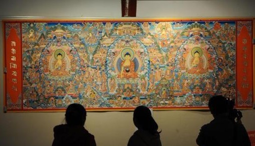 據(jù)介紹,這幅釋迦牟尼本生傳巨型唐卡,長3.3米,寬1.2米,由海珉和青海熱貢4名僧人歷時2年創(chuàng)作而成。和所有的傳世唐卡一樣,這幅唐卡色彩艷麗,圖案栩栩如生。雖然整體工程巨大,但小到每一根頭發(fā)、每一朵云彩、每一片樹葉,都精致逼真,用筆妙到巔毫。