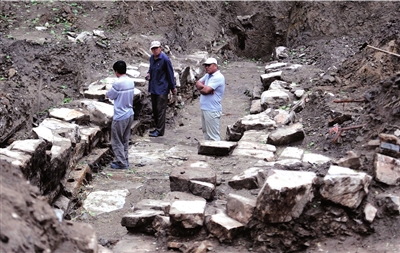 現(xiàn)場破土的地方有兩塊,相隔一條柏油路。路北側(cè)挖得淺,面積也小,路南側(cè)面積較大,已挖出兩三米深。在南側(cè)的坑內(nèi),青石陣溝槽分明,呈現(xiàn)為水渠狀,石頭上有圓的樁眼,還有腐朽的木樁。