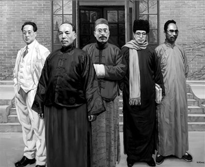 作品描繪了5位在中國近代學術史上具有重要影響的學術大師,從左向右依次為:趙元任、梁啟超、王國維、陳寅恪、吳宓。陳丹青將5人在畫面上一字排開,這也是他的典型構圖之一。陳丹青敏銳地抓住了眾人的不同特點,人物精神氣質躍然紙上而入木三分。畫面整體的棕黃色調醞釀了懷舊的濃郁氣氛,一種穩(wěn)定而深沉的力量撲面而來。據雅昌藝術網顯示,這幅作品曾經在2007年保利秋季拍賣會夜場出現過,當時的成交價為1344萬元。