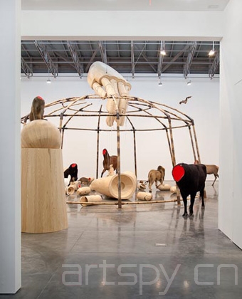 在這場展覽中,黃永砯使用了經(jīng)過標(biāo)本剝制術(shù)處理的動物這一在其早期作品中便有呈現(xiàn)的材料,展出的三件裝置作品探索了時間、混亂的概念以及宗教與權(quán)力之間的關(guān)系。在主展廳中展出的作品“Circus”由一只巨大的“木手”提著一個竹編的圍欄組成,圍欄內(nèi)外像是有12只沒有腦袋的動物正在上演一場“木偶戲”一般。它們的脖子上揚,仿佛都在“凝視”一具身著長袍的猴子的骷髏——后者受到了中國古典小說《西游記》中的孫悟空的啟發(fā)——骷髏的手中則提著一個更小的木偶。這種茫然呆板的“神”與被其迷住的觀眾之間的對比指明了一個問題:誰或是什么在這里起支配作用;這同時邀請了觀眾再次衡量其對各種關(guān)系的理解——比如與他人的關(guān)系,與他/她所生存的世界的關(guān)系。