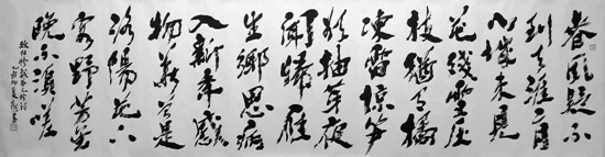 總之,在觀賞其書(shū)法筆墨時(shí),總會(huì)令人體悟到:或雄壯、或悲戚、或靜寂、或高傲、或?yàn)⒚?、或孤傲、或剛?qiáng)、或柔美、或遒麗、或儒雅、或超逸,或跌宕起伏、或悲愴奮發(fā),或雄武神威、或雍容華貴、或靈姿秀發(fā)、或雄姿煥發(fā)……等等,使得漢字的獨(dú)特魅力被淋漓盡致地展現(xiàn)出來(lái),達(dá)到了出神入化之境地。其深邃的筆墨線條功力不僅富有哲理性、情感性、藝術(shù)性,而且富有深厚的傳統(tǒng)性、高尚的時(shí)代性和強(qiáng)烈的個(gè)性,通過(guò)其書(shū)法筆墨線條和結(jié)體、章法布白之神妙變化的表現(xiàn),使?jié)h字書(shū)法藝術(shù)煥發(fā)出強(qiáng)大的內(nèi)在生命力和無(wú)尚的藝術(shù)美,總令人遐想、陶醉與神往,而感嘆不已!