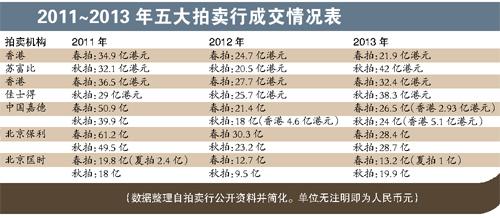 市場上像羅先生這樣的人并不少。據(jù)本報獨家整理的數(shù)據(jù)顯示,香港蘇富比、香港佳士得、中國嘉德、北京保利、北京匡時五大拍賣行在2011年~2013年的成交情況基本呈現(xiàn)一個趨勢:2011年最高,2012年回落,2013年略好于2012年,但大多數(shù)未達(dá)到2011年的水平。