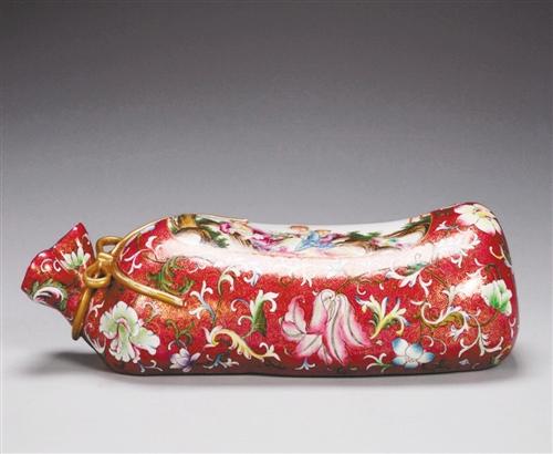據(jù)介紹,這件“寶貝”來頭不小,其底部有“大清乾隆年制”紅彩款,是當時乾隆帝夏季納涼御用的瓷物,全世界僅存一件,名曰清乾隆琺瑯彩瓷枕。