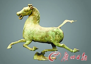 銅奔馬剛剛出土的時(shí)候并未引起重視。直到1971年,郭沫若陪同柬埔寨親王一行訪問蘭州,很偶然地看到了這匹銅奔馬,當(dāng)即大為贊嘆,認(rèn)為是文物中的寶中 之寶,就算是拿到世界上都是一流的藝術(shù)品。后來,著名的敦煌學(xué)家常書鴻看到銅奔馬后也親自為《光明日報(bào)》撰文,稱其為“中華民族藝術(shù)傳統(tǒng)中形神兼?zhèn)洹忭?生動(dòng)、形妙而有壯氣的杰作”。銅奔馬的聲名才變得越來越大。