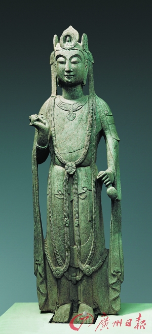 石觀音菩薩立像為隋代文物,于甘肅省秦安縣出土,像高132 厘米。頭戴四瓣花冠,冠正面飾阿彌陀佛像,以示觀音將來(lái)繼承阿彌陀佛在西方極樂(lè)世界成佛。面形圓潤(rùn),眉目清秀,表情慈善安詳。袒上身、斜披絡(luò)腋,頸佩寬邊 項(xiàng)圈,正中綴一寶石,左右肩頭各飾三條披帶。整個(gè)造像刻畫(huà)細(xì)膩,手法洗練,神態(tài)自然。