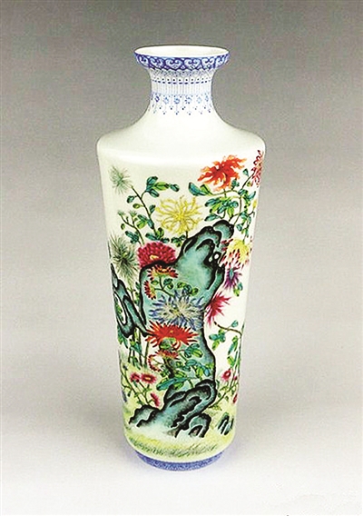 筆者收藏有一款民國時期的新粉彩敞口瓶(如圖),它口徑4厘米,底徑5.6厘米,高20厘米,敞口、細頸、豐肩、束腰,宛如身材修長、亭亭玉立的美人,十分好看。而更為精美的是上面的圖案,筆者把它叫做“秋菊圖”,只見山石之上,秋菊綻放,紅黃相映,大小相宜,肥瘦得體。與傳統(tǒng)的粉彩瓷上文人畫孤芳自賞、遺世獨立的風格不同,圖中的菊花奔放而熱烈,喜慶而大方,展現(xiàn)出新粉彩瓷貼近世俗的獨特風格??瞻滋幱蓄}詩云:“淡映殘紅迷老圃,濃拖斜照沒東籬。”樂而不淫,哀而不傷,懷戀之下,為之沉醉。