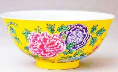 這件清康熙黃地琺瑯彩牡丹紋碗高7.2厘米,口徑15.2厘米,足徑5.7厘米。敞口,口沿下輪廓線緩收,腹部微豐,圈足。外壁琺瑯彩繪有牡丹花,青翠的綠葉,襯托兩朵盛開(kāi)的碩大的牡丹花,一朵粉紅色,一朵深藍(lán)色,花形優(yōu)美,顏色絢麗、清雅,顯出其雍容華貴大家之氣。碗底藍(lán)料彩方框內(nèi)楷書(shū)“康熙御制”雙行四字印章款。