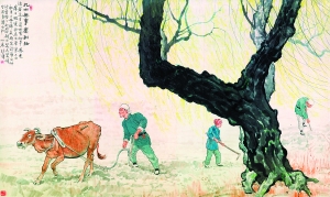 雖然《九州無事樂耕耘》的整個(gè)畫面并不張揚(yáng),但卻具有一種沉穩(wěn)雄健的視覺效果和意高韻亢的自信格調(diào)。畫中的耕牛以赭石敷色,筆致精確,每筆的濃淡和干濕皆表現(xiàn)了牛毛的質(zhì)感,畫出了牛身各部分的向背凹凸,盡管瘦骨嶙峋,但卻竭盡全力。牛象征著勤奮踏實(shí),犁和鋤象征著開拓進(jìn)取的精神。此時(shí)全國各條戰(zhàn)線正需要這樣的一種精神。這也是全國各族人民全力支援前線的精神寫照。作品中,最前面的那個(gè)老農(nóng)雙腳邁開,身軀前傾,手掌攥緊,正辛勤地耕耘,臉部和手部的肌肉因凝聚力量而呈現(xiàn)出收緊之感,這個(gè)瞬間的動(dòng)態(tài)生動(dòng)逼真。后兩者一揮鋤,一彎腰,均在“樂耕耘”。這種腳踏實(shí)地的勞動(dòng)場(chǎng)面引人深思:也許前線將士正在浴血戰(zhàn)斗,后方人民只有扎扎實(shí)實(shí)做好自己的本職的工作才是對(duì)前線的最好支援。