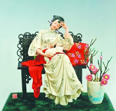 王玓的面塑多是仕女或古裝美女。她解釋,這一方面與自己的性格以及審美取向有關(guān)——她喜歡古代賢淑、柔弱的美女,另一方面也與她從小就喜歡劉繼卣的古裝連環(huán)畫及楊柳青傳統(tǒng)年畫有關(guān)。
