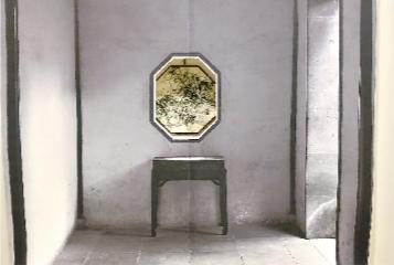 《出入》作品遠看似一個中國傳統(tǒng)園林立體空間,墻面上有一扇八邊窗,里面透出園林花卉,近看其實還有奧妙,在漏窗之后,是一幅中國傳統(tǒng)的扇面畫。這種全新的組合方式,是將中國園林通過漏窗借景手法所形成的“園入畫中”,置換為扇面與墻面所形成的“畫中之園”。