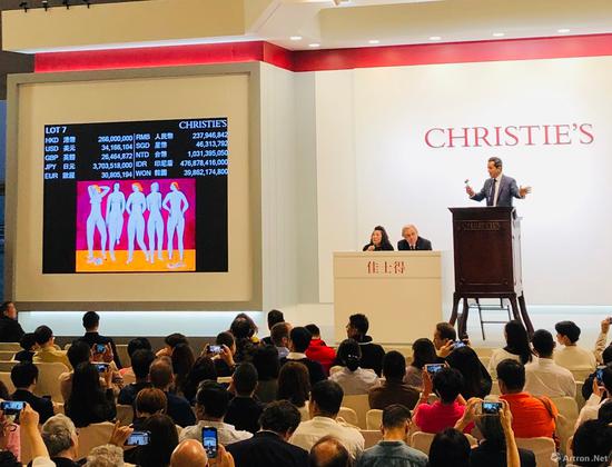 (雅昌藝術(shù)網(wǎng)訊)2019年11月23日晚,佳士得香港2019年秋拍“二十世紀(jì)及當(dāng)代藝術(shù)晚間拍賣(mài)”在香港會(huì)議展覽中心舉槌,本場(chǎng)共53件精品上拍。其中,全場(chǎng)估價(jià)最高,也是2019年亞洲區(qū)拍賣(mài)估價(jià)最高的常玉巨作《五裸女》當(dāng)晚以1.9億港元起拍,競(jìng)爭(zhēng)主要圍繞佳士得幾個(gè)大業(yè)務(wù)代表的電話委托之間,最終以2.66億港元落槌于佳士得亞洲及世界藝術(shù)部環(huán)球董事總經(jīng)理劉珺的電話委托,加傭金最終以3.039億港元成交。超越了一個(gè)月剛在香港以1.98億成交的《曲腿裸女》,再度刷新了常玉個(gè)人拍賣(mài)紀(jì)錄。