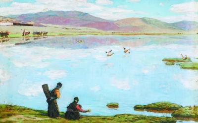 第一代留法畫家顏文樑暮年(1994年)創(chuàng)作的《重泊楓橋》,畫名頗富深意。作為江蘇省的留法畫家,早年留學(xué)之時,印象派已成為新的經(jīng)典畫派,而馬蒂斯的“野獸派”和畢加索的“立體主義”正方興未艾。顏文樑堅定地選擇了印象派的風(fēng)格作為自己的藝術(shù)追求。1984年創(chuàng)作的《重泊楓橋》是他將中國主題融入印象派風(fēng)格的又一次成功嘗試。畫中的色調(diào)已不是莫奈那盛開睡蓮的池塘里呈現(xiàn)出的種種色調(diào)表現(xiàn)方式,而是他幾十年探索下來的一整套色彩與筆觸表現(xiàn)手法,如夢似幻地抒發(fā)出他心中揮之不去的濃濃鄉(xiāng)愁。潘世勛的《莎迦春汛信》,明澈的高原湖泊,返照出60年代初一段短暫的寧靜心緒。這件作品顯示出畫家已經(jīng)在探索油畫民族化之路,與當(dāng)時的代表畫家董希文一起形成了自家面貌。