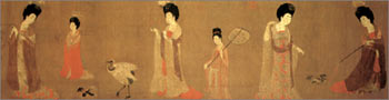 《簪花仕女圖》一直被視為古代繪畫中的珍品,畫面描繪了五位盛裝高髻的貴族婦女,她們體態(tài)豐腴,身著華美的服飾,顯示出雍容和優(yōu)雅的氣質(zhì)。長期以來,人們認(rèn)為它的作者足唐代的周昉。但近年來學(xué)者們通過對作品的深入研究,發(fā)現(xiàn)這個說法存在著相當(dāng)大的疑點(diǎn)。著名學(xué)者徐邦達(dá)認(rèn)為.從畫中人物“長袖平地”的服飾造型上看,它應(yīng)是晚唐時的作品,這首先與周昉的生活時代不一致。謝稚柳從作品的時代風(fēng)格等因素出發(fā),也認(rèn)為雖然作品在整體氣勢上帶有唐代的痕跡,但它極有可能不是唐代作品,因為在現(xiàn)存的唐代繪畫如《高逸圖》、《宮樂圖》以及敦煌壁畫中都找出與《簪花仕女圖》中人物服飾相類似的例子。而且人物的嘴、眼和鼻等細(xì)節(jié)刻畫也都與唐人的繪畫造型截然不同。問題是,如果它不是唐代的繪畫,那么它又屬于哪個時代呢?學(xué)者們?nèi)詮姆椩煨腿胧?,判斷它出自南唐的可能性最大,因為畫中人的高發(fā)髻造型在南唐比較盛行,李煜也留下過“高髻凌風(fēng)”的詩句,這從側(cè)面印證了當(dāng)時的民俗。結(jié)論雖然暫時得出,但要最后鑒定《簪花仕女圖》的創(chuàng)作年代,仍缺乏直接的資料。或許,考古學(xué)和美術(shù)史研究的發(fā)展將最后揭開此千古之謎。