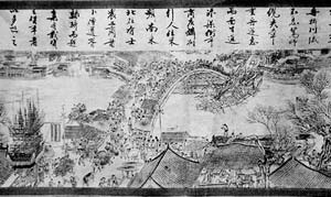該畫長(zhǎng)460厘米,寬30厘米,為絲綢布面,色澤清淡典雅。畫上寂靜的原野、稀疏的村落、田疇柳煙,構(gòu)筑出寧?kù)o的農(nóng)村圖畫。縱橫交錯(cuò)的街道、高大的城樓、鱗次櫛比的店鋪、摩肩接踵的人群,描繪出繁華的市區(qū)街景。全圖共有人物550多人、馬20多匹、驢牛20多頭、船只20多艘、樹木30多株,整個(gè)畫面繁而有序,各種人物衣著不同、神態(tài)各異。