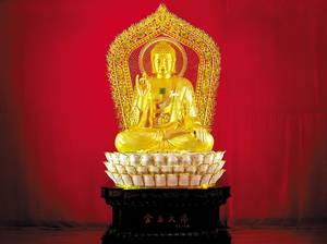 金玉大佛即佛教創(chuàng)始人釋迦牟尼造像,由佛身、背光、千葉寶蓮、佛臺四部分組成,總高度約為2.56米,寬約為1.5米,以黃金、白金、翡翠、鉆石、寶石為主要材料,金和玉巧妙過渡,交相輝映,渾然一體。創(chuàng)造了六個世界第一:第一尊金玉大佛,世界絕無僅有;第一“玉鑲金”的千葉蓮花寶座;第一長度的大型花絲鑲嵌珠寶的金佛光;第一大面積施以金鏨工藝塑造佛陀完美形象和遍及周身的服飾圖案;第一座大型花絲鑲珠玉的金佛光;第一小的微雕金佛僅為20毫米,共八十五尊藏于佛光的背光之中。