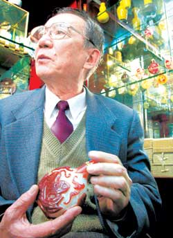 一款乾隆年間雕工的“白玉地套紅花卉”鼻煙壺被黑老小心地放置于一個錦盒內(nèi),打開盒蓋,記者征得黑老的同意后,將鼻煙壺小心地豎立起來仔細(xì)觀賞。此款鼻煙壺為“套料”所做。所謂“料”,是清代北京玻璃的簡稱。“套料”就是在其胎體表面套上一種或幾種顏色的料,是清代裝鼻煙的容器。該鼻煙壺現(xiàn)市價1萬元左右,比起十年前的價格也整翻了十倍。(王小娟 文并攝) 稿件來源:北京娛樂信報