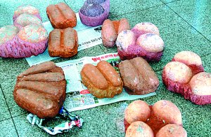 本月13日上午10時25分,一名韓國籍游客手推行李車登上了去往韓國仁川的C045航次班輪,在他的行李車上放有7個紙箱,由于這7個紙箱重量與體積明顯不符,機警的口岸海關工作人員立即要求這名游客開箱查驗。在對紙箱進行查驗中,海關工作人員發(fā)現(xiàn),這7個紙箱中有包裹嚴密的堆狀化石11座,在每座化石堆長有2到3個圓形或長橢圓形生物化石,共計30枚,其中長橢圓形化石14枚,圓形化石16枚。