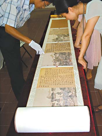珠海市博物館昨天正式向觀眾展示《圓明園四十景圖》珍藏畫卷。《圓明園四十景圖》秉乾隆皇帝旨意,由當時最知名的宮廷畫師唐岱、沈源、冷枚等歷十一年精心繪制而成。畫成之后,乾隆皇帝御筆題詩,由工部尚書汪由敦書寫。該畫卷長28米,寬38厘米,是目前世界上最長的絹制彩色工筆畫。