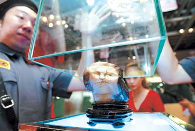一塊面似老嫗、名為“歲月”的戈壁瑪瑙在數(shù)碼大廈免費展出。這塊被權威專家估價為9600萬元的大漠奇石,形成于2億年前的火山噴發(fā)。它高約13厘米、寬8厘米、厚8厘米,重量在1公斤左右。其主人趙立云稱,這是他于1997年冬天在中蒙邊界處的蘇紅圖地區(qū)尋到的寶貝。